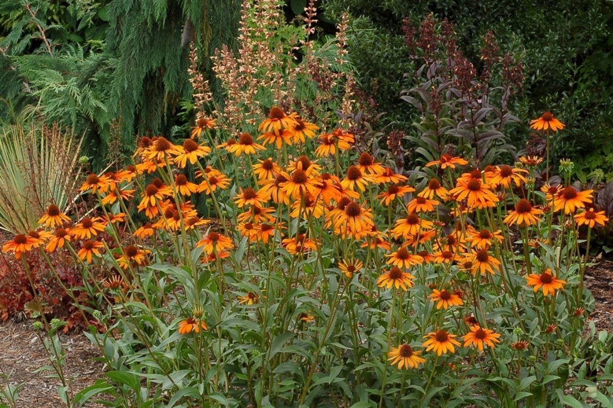 - OmschrijvingEchinacea purpurea 'Tiki Torch' met echt oranje bloemen, mooi met het bruinoranje hart.
