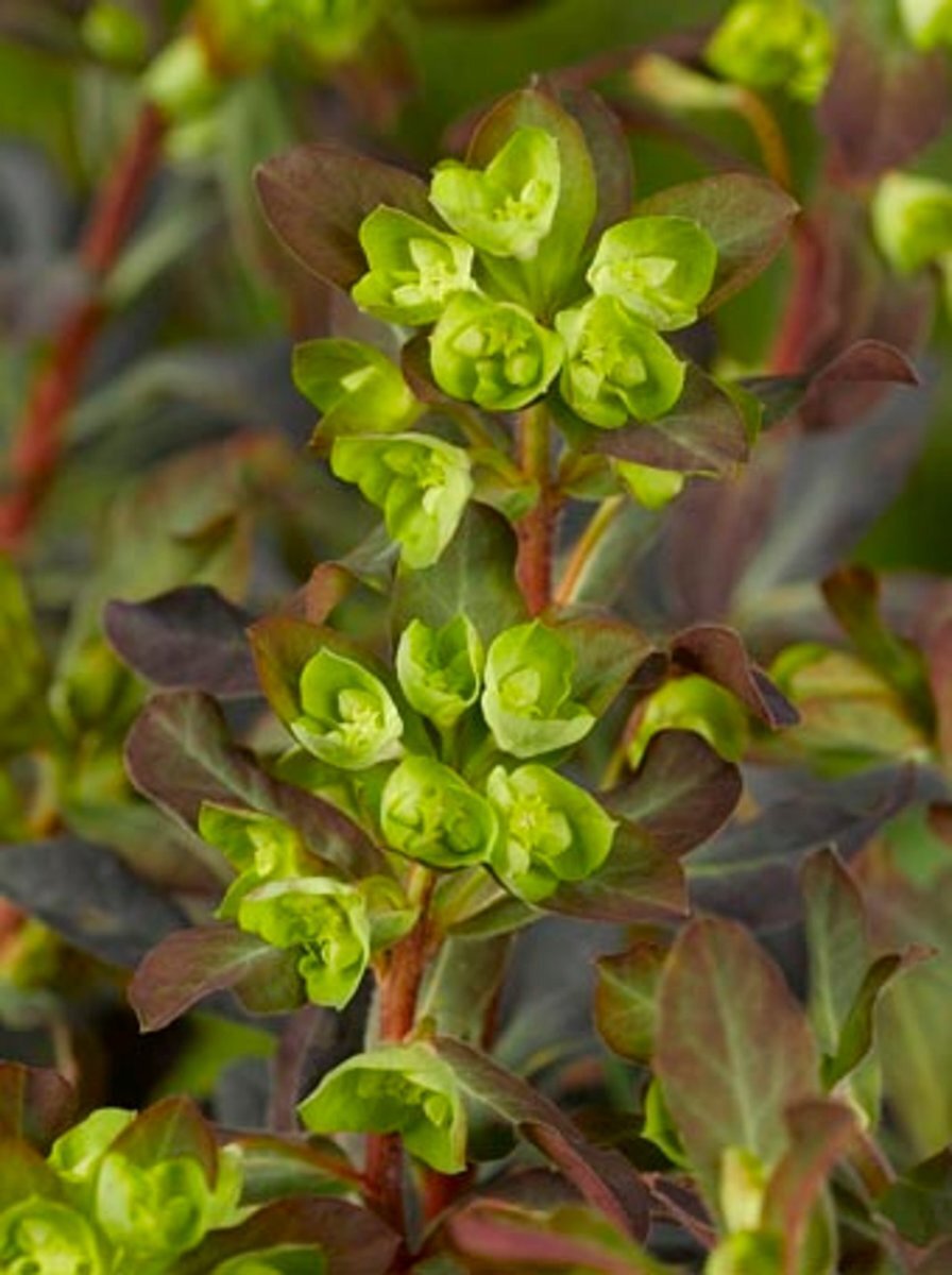 - WindEuphorbia amygdaloides 'Purpurea', in het nederlands amandelwolfsmelk genaamd is een bossige halfwintergroene vaste plant met attractieve roodpaarse spatelvormige bladeren en groengele, chartreusekleurige bloemen in het voorjaar. , ongevoelig, zeewind bestendig