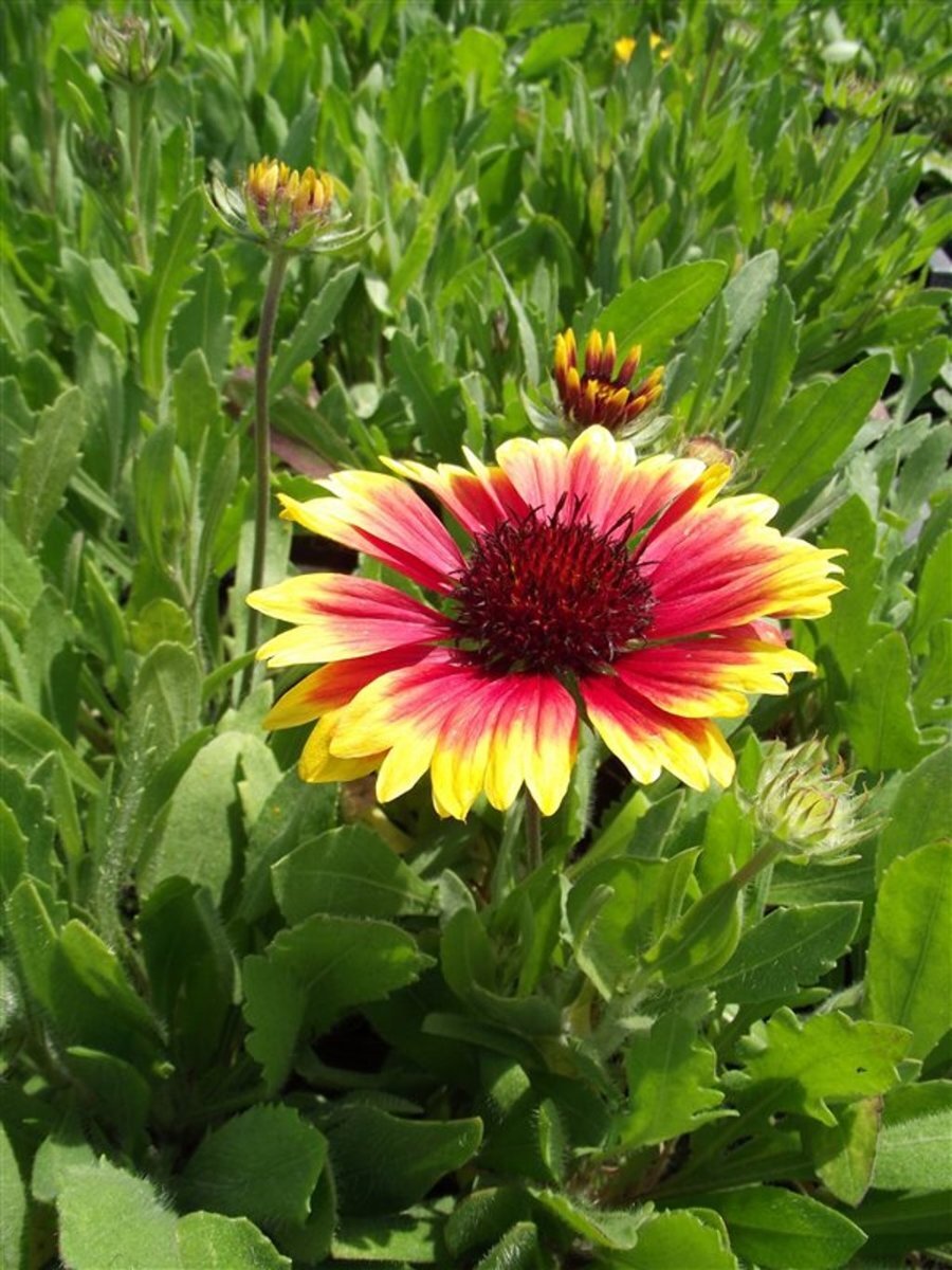 - WindGaillardia aristata 'Kobold' is een kortlevende vast plant met margrietachtige roodoranje bloem (composiet) met gele toppen, rond een rood hart. Stengels en bladeren grijsgroen., ongevoelig