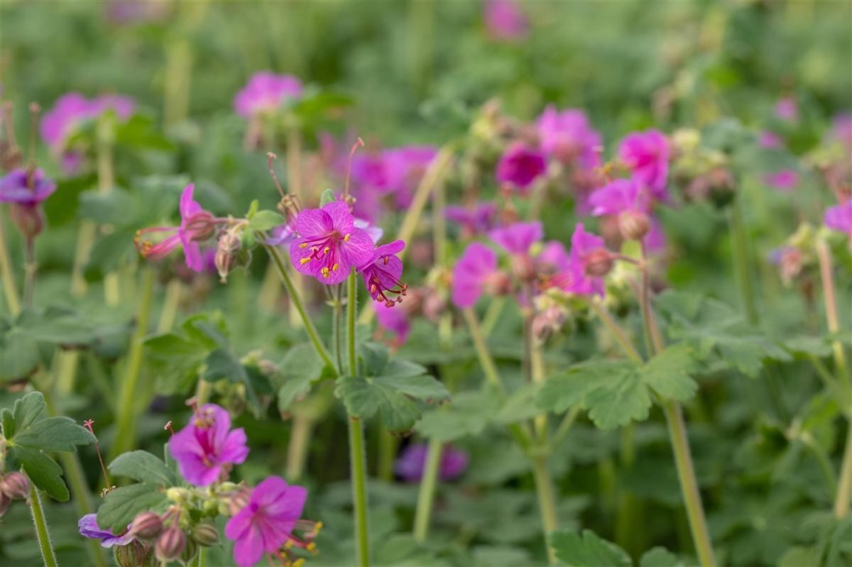 - OmschrijvingGeranium macrorrhizum 'Bevan's Variety' is een snelgroeiende geranium vertoont een compacte, kruipende groeiwijze d.m.v. rizomen en vormt een uitstekende bodembedekker, zelfs tussen boomwortels. Is vooral mooi in grote groepen.