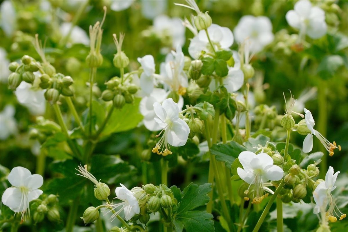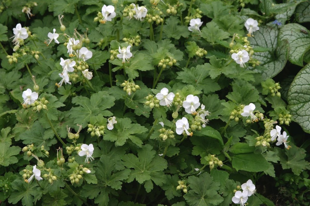 - WindGeranium macrorrhizum 'White Ness' is een compacte, kruipende bodembedekker, zelfs tussen boomwortels. Bloeit met zuiverwitte bloemen boven een rond en donzig aromatisch blad. In de herfst kleuren de bladeren rood en brons., ongevoelig, zeewind bestendig