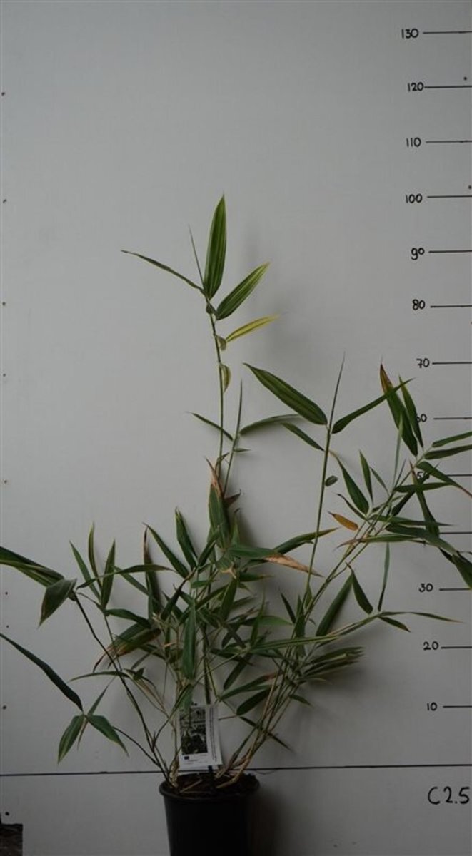 - Latijnse naamHibanobambusa tranq. 'Shiroshima'