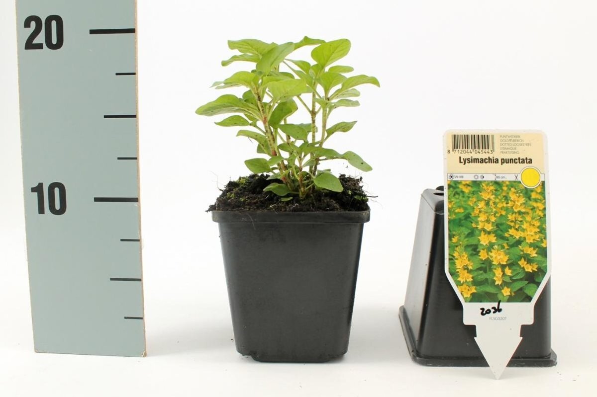 - OmschrijvingLysimachia punctata is een robuuste vaste plant met rechtopstaande stengels. Felgele bloemen bloeien op dezelfde stengel als de lancetvormige bladeren, in de bovenste bladoksels.