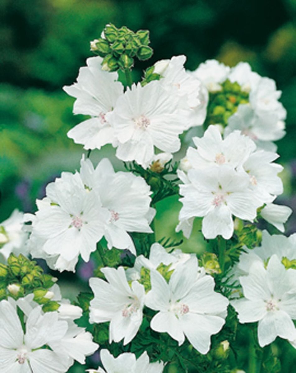 - WindMalva moschata 'Alba' is een zeer rijkbloeiende soort met witte bloemen waarvan de bloemblaadjes gefranjerd zijn en het grijsgroen blad gelobd en fijn ingesneden is., weinig gevoelig