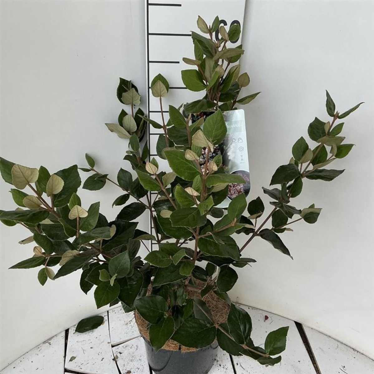 De maat van heesters en haagplanten worden weergegeven in cm in hoogte, gemeten vanaf het maaiveld.